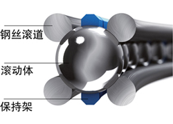 基于該原理:軸承的核心部件由四條鋼絲滾道組成。采用專(zhuān)門(mén)研發(fā)的磨削工藝,使其滾道與滾珠直徑完全匹配,滾動(dòng)體在四條鋼絲滾道上平滑滾動(dòng),不與周?chē)Y(jié)構(gòu)發(fā)生接觸。借助四點(diǎn)接觸幾何結(jié)構(gòu),可承受來(lái)自任何方向的負(fù)荷。