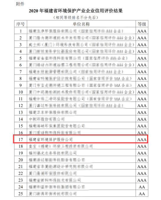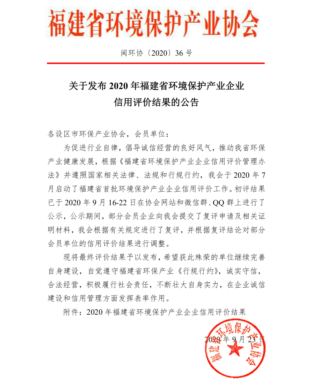 9月23日,2020年福建省環境保護產業企業信用評價結果公布,福建省環境保護股份公司在企業整體水平、財務狀況、管理水平、技術能力和信用情況等考量指標體系中均表現優異,被授予福建省環保產業企業信用評價等級最高級別AAA級。