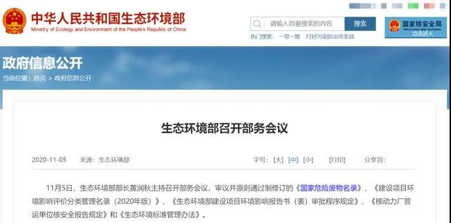 11月5日,生態(tài)環(huán)境部部長(zhǎng)黃潤(rùn)秋主持召開(kāi)部務(wù)會(huì)議,審議并原則通過(guò)制修訂的《國(guó)家危險(xiǎn)廢物名錄》、《建設(shè)項(xiàng)目環(huán)境影響評(píng)價(jià)分類(lèi)管理名錄(2020年版)》、《生態(tài)環(huán)境部建設(shè)項(xiàng)目環(huán)境影響報(bào)告書(shū)(表)審批程序規(guī)定》、《核動(dòng)力廠(chǎng)營(yíng)運(yùn)單位核安全報(bào)告規(guī)定》和《生態(tài)環(huán)境標(biāo)準(zhǔn)管理辦法》。