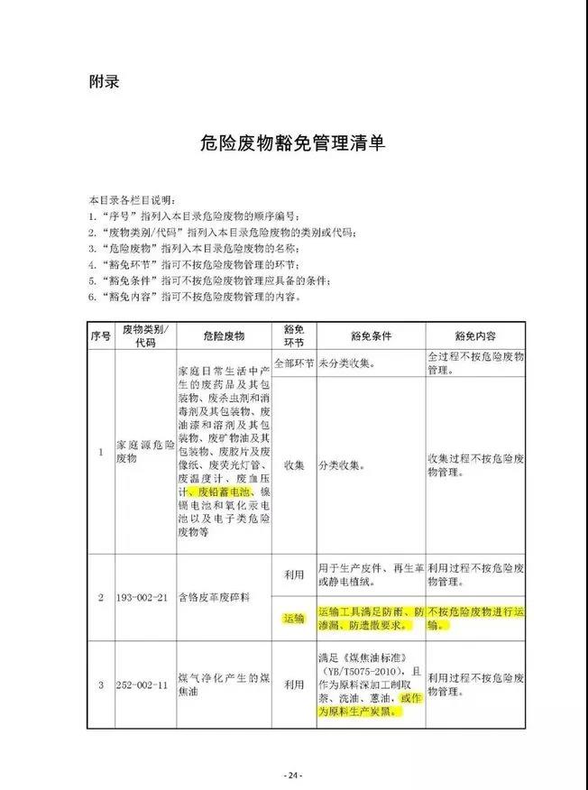 第四條列入本名錄附錄《危險(xiǎn)廢物豁免管理清單》中的危險(xiǎn)廢物,在所列的豁免環(huán)節(jié),且滿(mǎn)足相應(yīng)的豁免條件時(shí),可以按照豁免內(nèi)容的規(guī)定實(shí)行豁免管理。