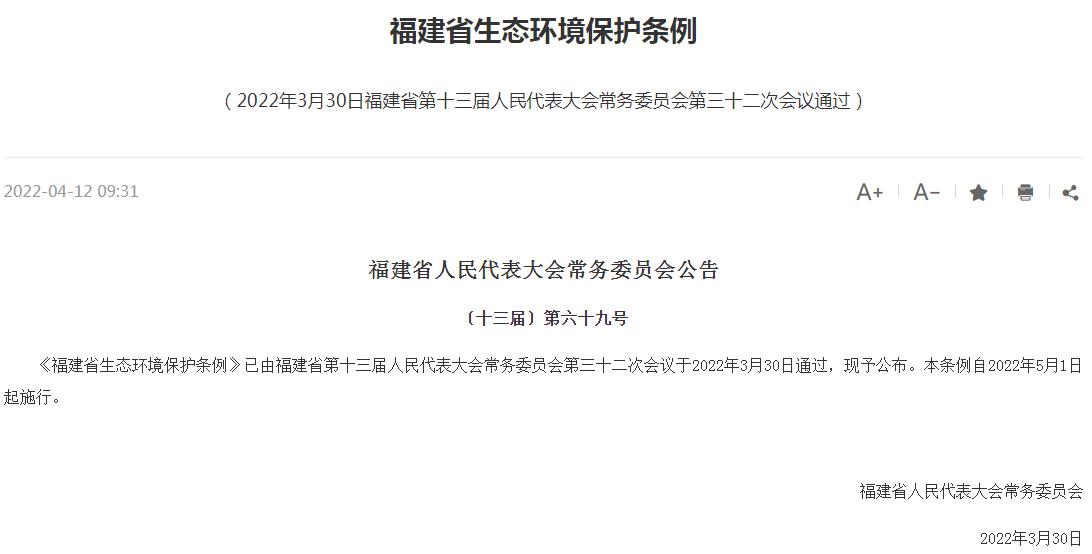 第七十四條 本條例自2022年5月1日起施行。1995年7月5日福建省第八屆人民代表大會常務委員會第十八次會議通過,2002年1月20日福建省第九屆人民代表大會常務委員會第三十次會議修訂,根據2012年3月29日福建省第十一屆人民代表大會常務委員會第二十九次會議通過的《福建省人民代表大會常務委員會關于修改部分地方性法規的決定》修正的《福建省環境保護條例》同時廢止。