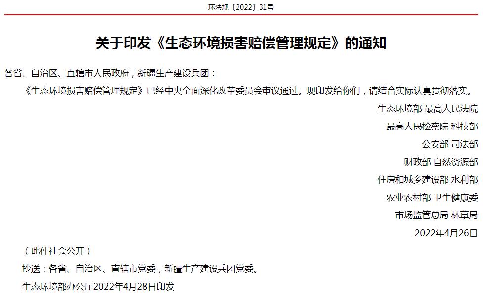 生態環境損害調查、鑒定評估、修復方案編制等工作中涉及公共利益的重大事項,生態環境損害賠償協議、訴訟裁判文書、賠償資金使用情況和生態環境修復效果等信息應當依法向社會公開,保障公眾知情權。