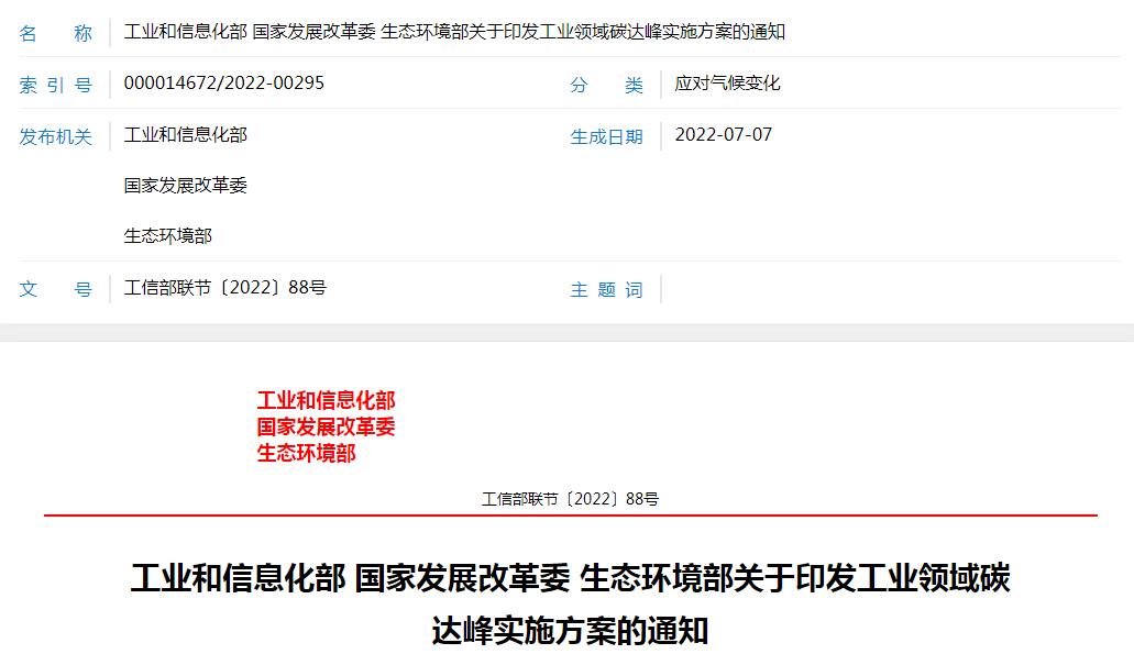 《工業領域碳達峰實施方案》已經碳達峰碳中和工作領導小組審議通過,現印發給你們,請認真貫徹落實。
