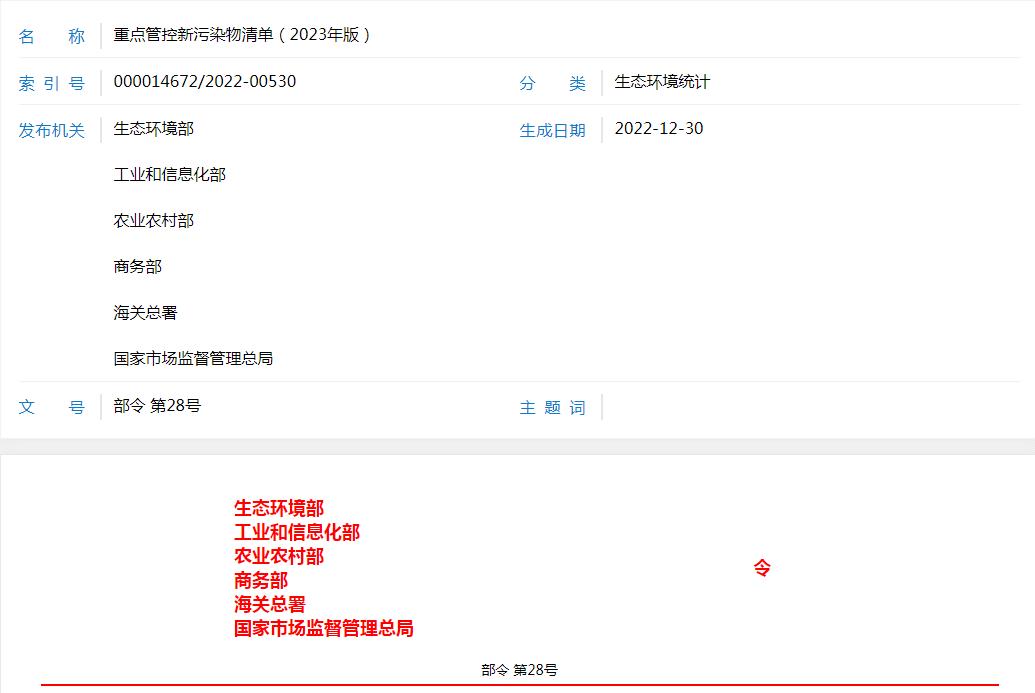 《重點(diǎn)管控新污染物清單(2023年版)》已于2022年11月29日由生態(tài)環(huán)境部2022年第五次部務(wù)會議審議通過,并經(jīng)工業(yè)和信息化部、農(nóng)業(yè)農(nóng)村部、商務(wù)部、海關(guān)總署、國家市場監(jiān)督管理總局同意,現(xiàn)予公布,自2023年3月1日起施行。